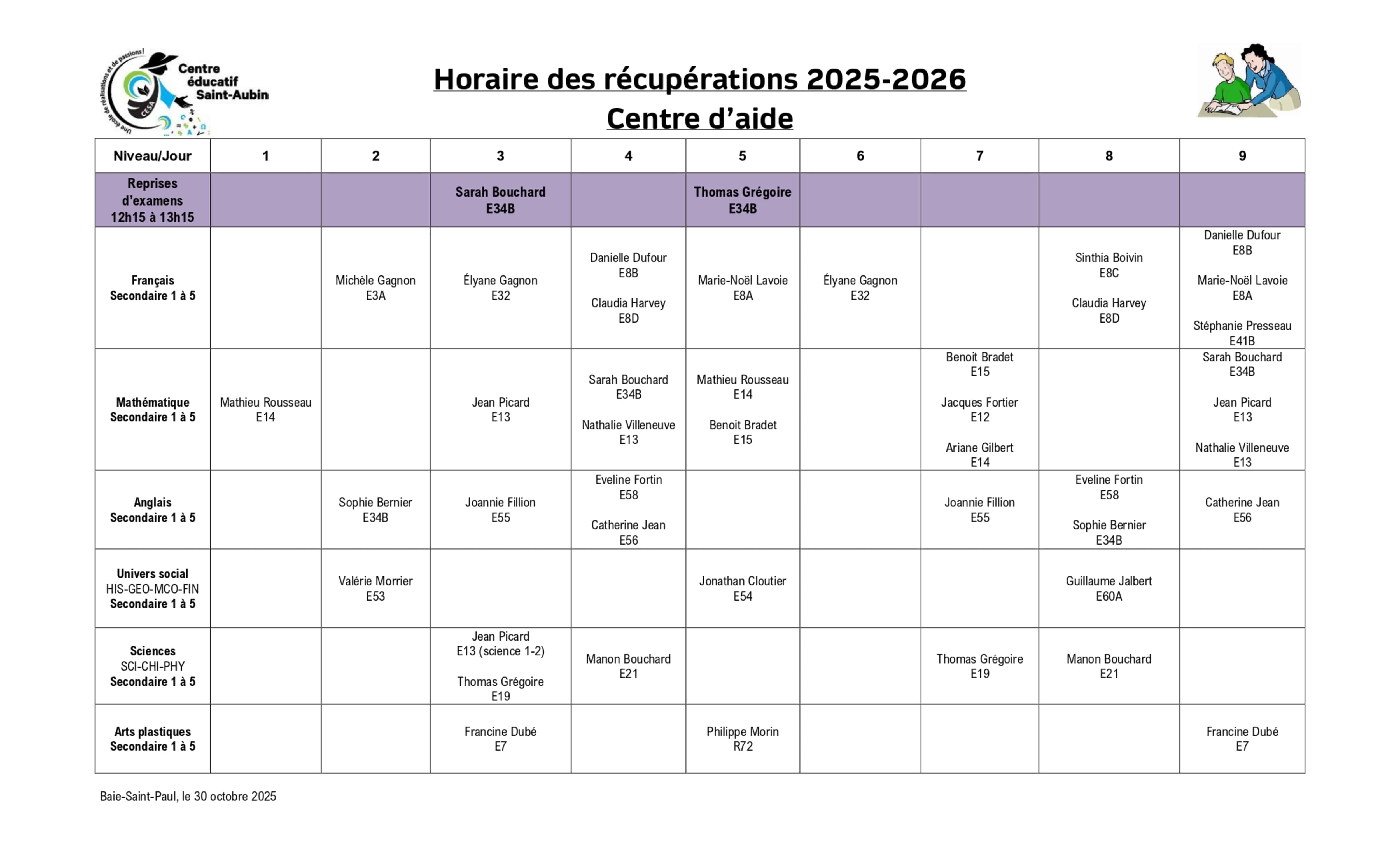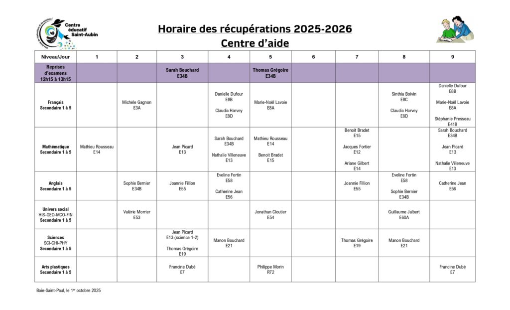 Récupérations et centre d’aide Moments prévus à l’horaire auxquels un enseignant se rend disponible pour offrir un soutien particulier ou un accompagnement dans une matière ciblée à l’ensemble des élèves de l’école.